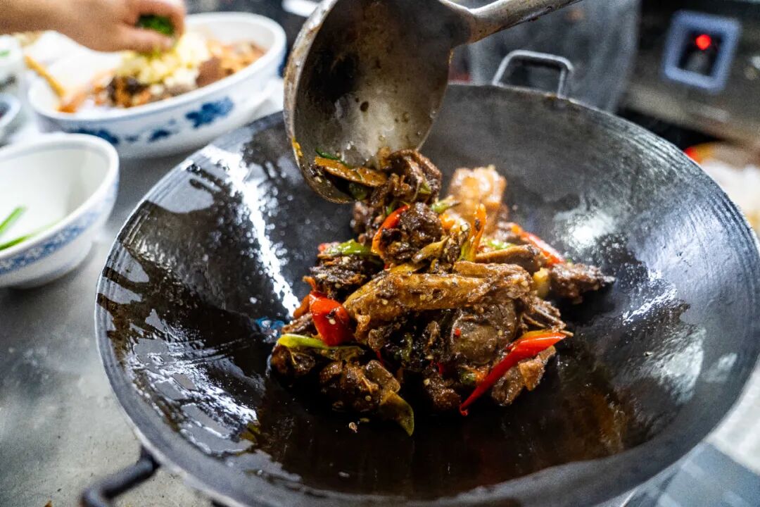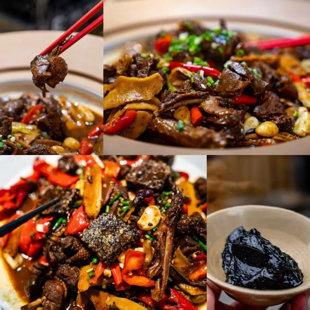 铁锅烧红,鸭肉下锅爆炒,加干辣椒、花椒、大蒜,炒到鸭皮焦脆,鸭血“哗”地倒进去,快速翻炒,让每块鸭肉都裹上鸭血。出锅时黑乎乎一团,看着不起眼,吃起来却惊艳——鸭血嫩滑,鸭肉香辣,辣得人冒汗,却越吃越想吃。辰溪人待客,要是端出血鸭,那就是把你当自家人了。