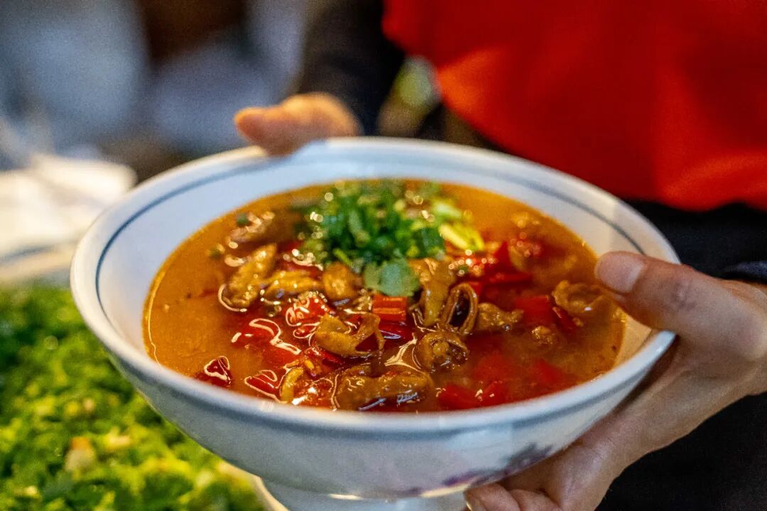 怀化食界不只有鸡鸭鹅。新晃黄牛肉纹理如墨,雪峰山乌骨鸡炖天麻汤鲜照影,通道侗家腌肉埋杉木桶发酵半年,蒸则满村飘香。新晃云锦食府李俊师傅擅做酸汤牛肉:“好牛肉黏手,下锅不碎,一口奶香!”牛四两切薄片,西红柿混秘制山胡椒油熬酸汤,涮三秒即熟。裹上锅巴粉,酸辣鲜灵在舌尖炸开,这酸汤,比贵州的还过瘾。