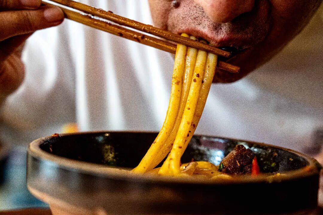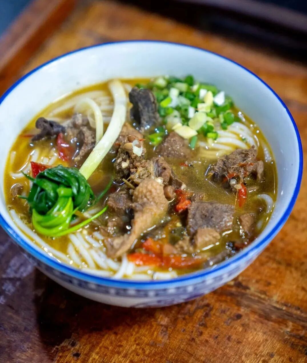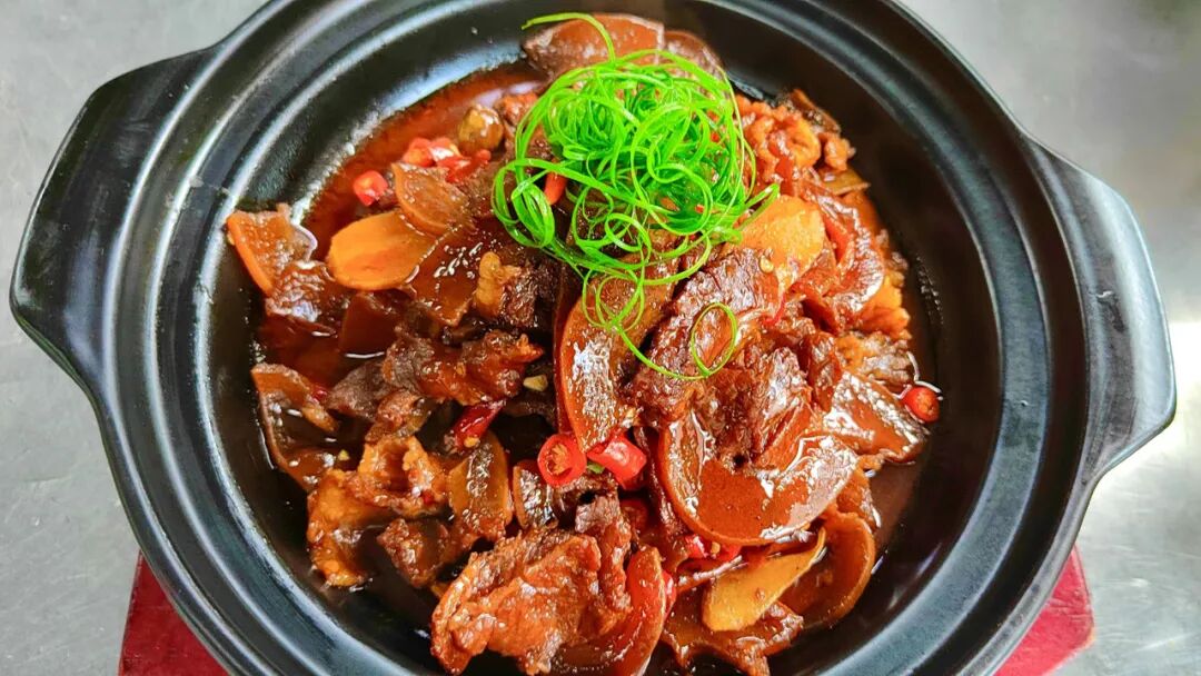 城东的炖缸粉馆藏着老怀化的记忆。灶台上码着十多个粗陶瓦缸,炒鸭、牛腩、脆哨在炭火上咕嘟冒泡,油花溅在缸壁上,烤出焦香。老板杨世东守着这个摊子八年,每天凌晨四点起床熬汤,他的炖缸粉由酒席演变而来。