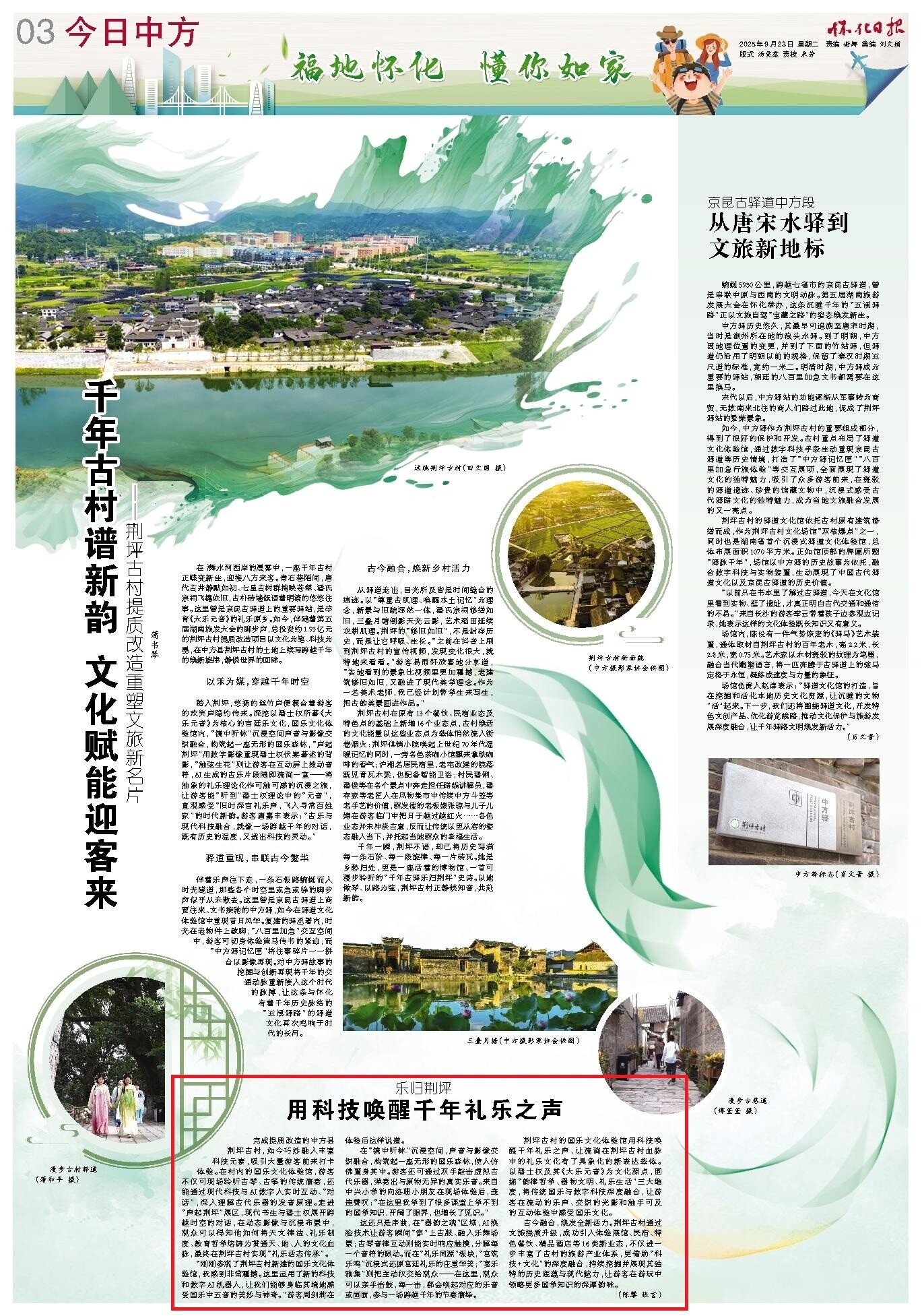 完成提质改造的中方县荆坪古村,如今巧妙融入丰富科技元素,吸引大量游客前来打卡体验。在村内的国乐文化体验馆,游客不仅可现场聆听古琴、古筝的传统演奏,还能通过现代科技与AI数字人实时互动、“对话”,深入理解古代乐器的发音原理。走进“声起荆坪”展区,现代书生与潘士权展开跨越时空的对话,在动态影像与沉浸布景中,观众可以得知他如何将天文律法、礼乐制度、教育哲学熔铸为贯通天、地、人的文化血脉,最终在荆坪古村实现“礼乐活态传承”。