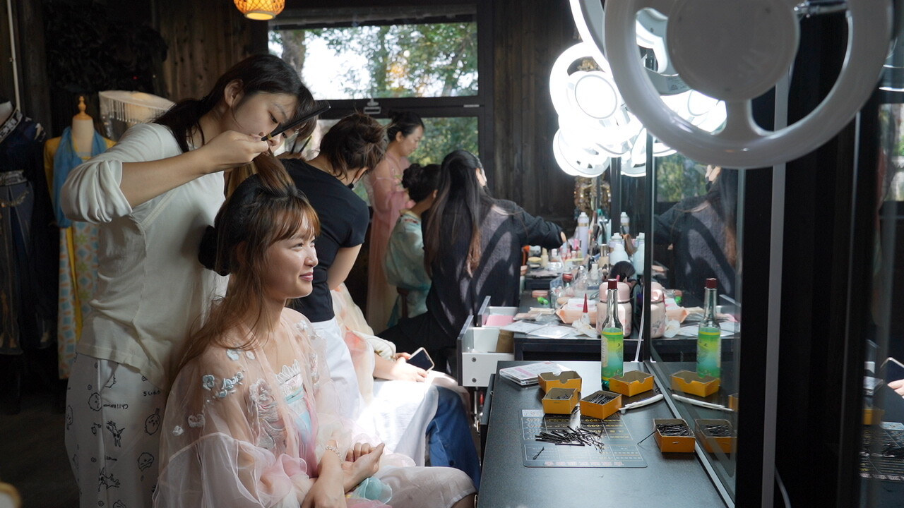 中方融媒9月28日讯(记者:邹贝婷)9月27日清晨,在中方县荆坪古村古驿道旁的古道边汉服茶舍里,等候妆造的游客早已排起小队,化妆师手不停歇,正细致地为身着汉服的游客打造古典妆容,眉笔勾勒、胭脂轻点间,游客沉浸式感受古风魅力。茶舍外,木质桌椅错落摆放,游客们围坐品茗,谈笑风生,构成一幅文旅融合的鲜活图景。
