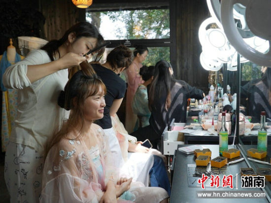 古道边汉服茶舍里旅游正在妆造。
