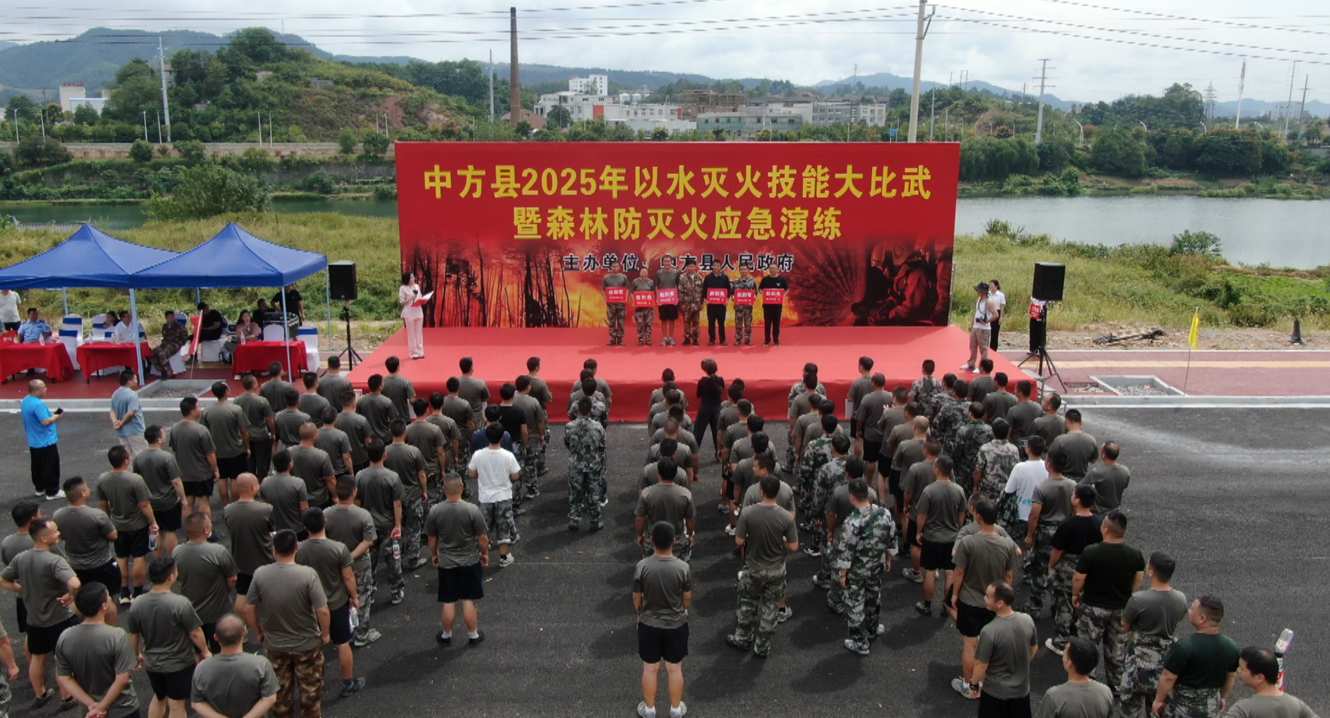 中方融媒9月29日讯(记者:梁洁 李建龙)9月29日,中方县在中方镇举行2025年以水灭火技能大比武暨森林防灭火应急演练,县委常委、政法委书记杨春斌到场观摩指导,全县12个乡镇的森林消防应急队伍参加演练比武活动。