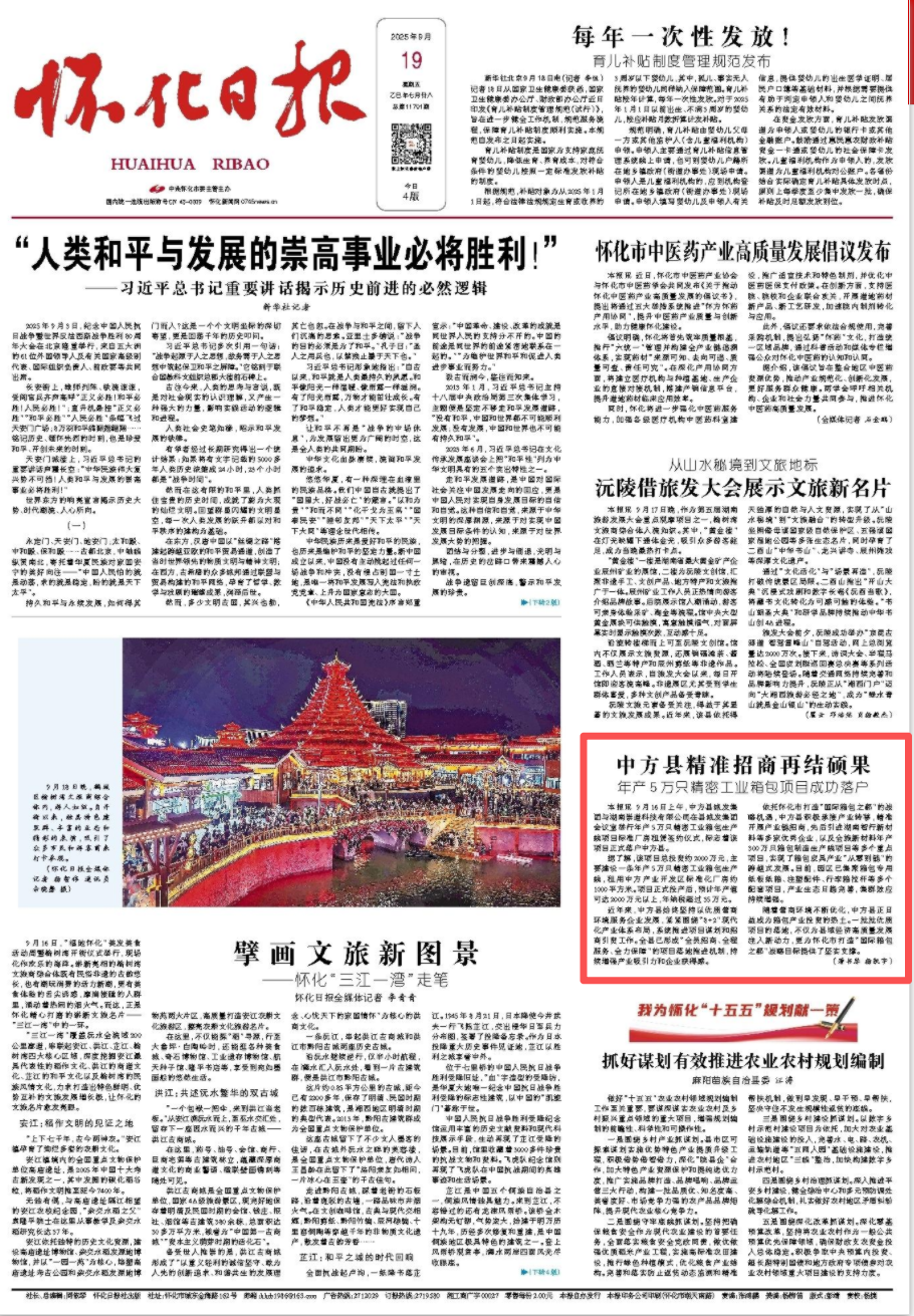 怀化日报头版|中方县精准招商再结硕果 年产5万只精密工业箱包项目成功落户