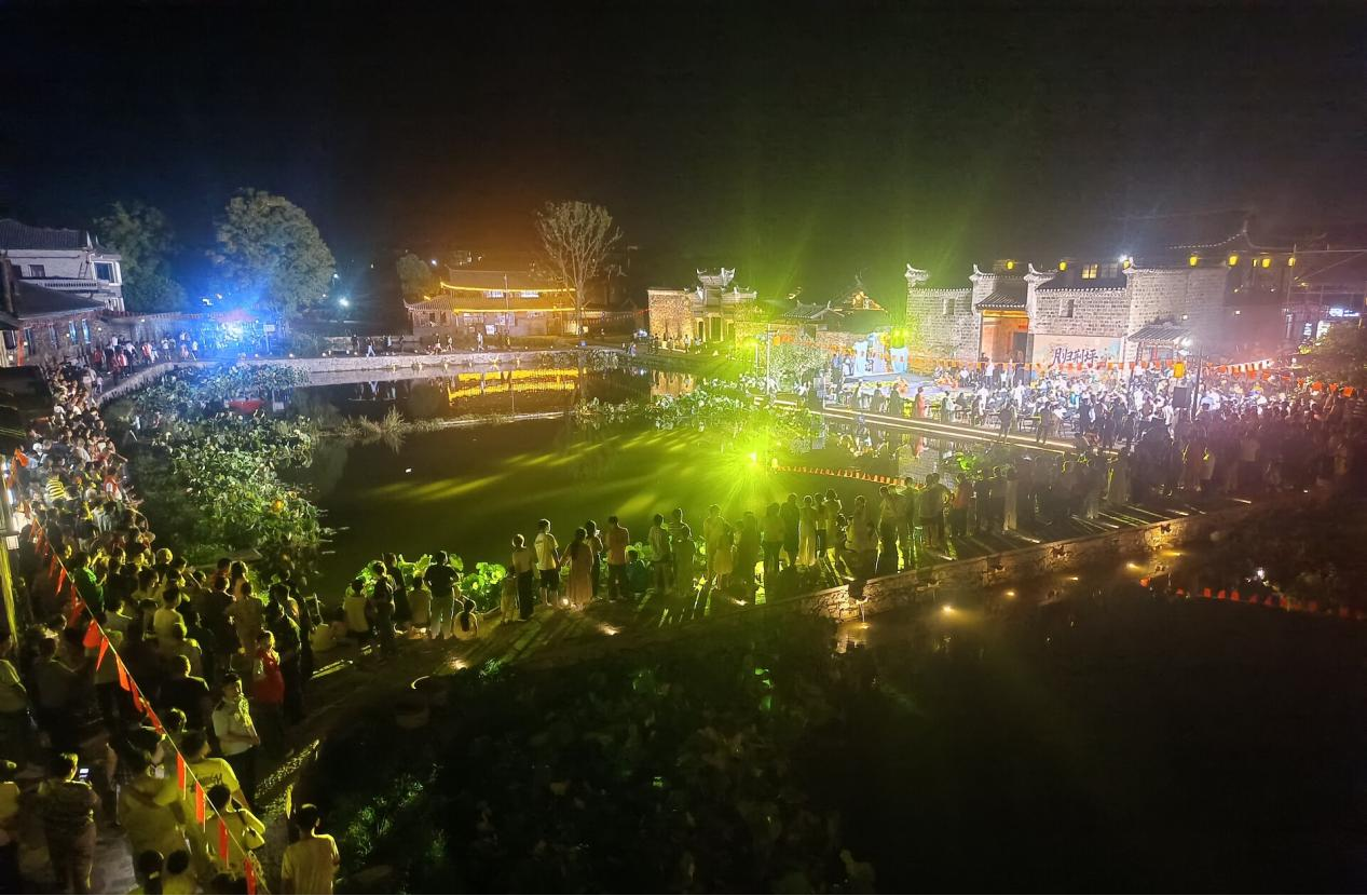 作为中方文旅的核心名片,荆坪古村“双节”期间精心策划多元活动,让传统文化与现代体验深度交融。月色浸润下的10月5日晚,三叠月塘畔“月归荆坪:荆坪不语·怀化原乡”中秋音乐雅集温情启幕,《彩云追月》《但愿人长久》等经典曲目婉转流淌,湘西作家彭学明与游客共话中秋民俗,全场齐诵《水调歌头》的声浪与月色交织,定格成古村月夜最动人的剪影。
