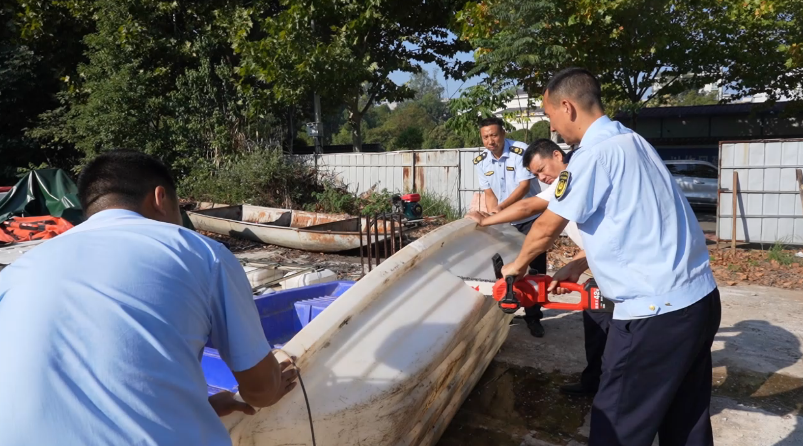 在销毁现场,待处理的违规物品整齐堆放,涵盖了近期执法过程中查获的多种非法捕捞工具与设施,具体包括地笼、电鱼设备、违规鱼竿等渔具,以及7艘无船名船号、无船舶证书、无船籍港的“三无”船舶。为确保销毁彻底、不留隐患,执法人员根据物品类型采取针对性处理方式:对钓具、网具、电鱼工具等,通过碾压、破碎等物理手段进行集中销毁,从根本上杜绝其再次流入市场或被用于非法捕捞;对涉案的7艘“三无”船舶,则进行现场拆解,拆解后的部件将按规定进一步处置,防止船舶残骸造成水域污染或被违规改造复用。