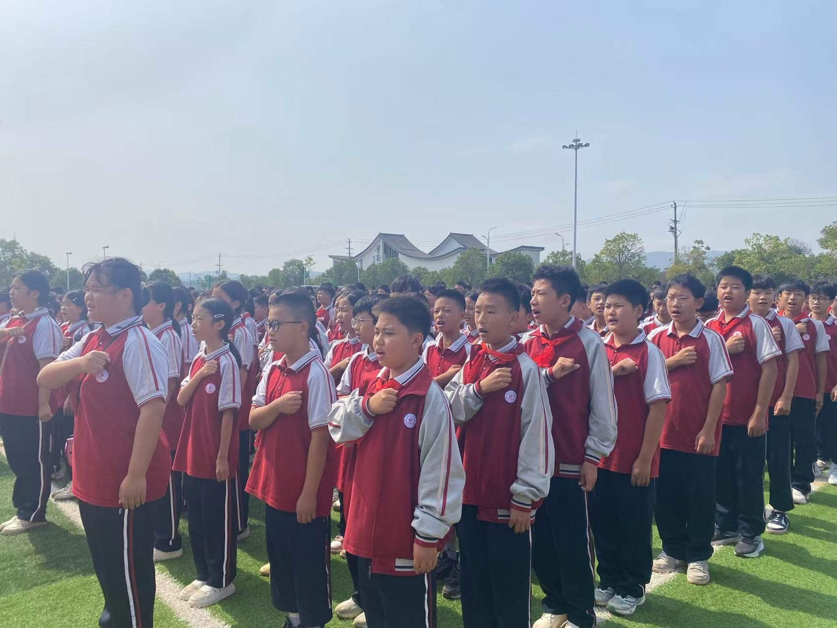 出旗仪式上,全体辅导员与队员行标准队礼,《中国少年先锋队队歌》激昂奏响,队员们齐声高唱,歌声嘹亮,饱含着对少先队组织的无限热爱。