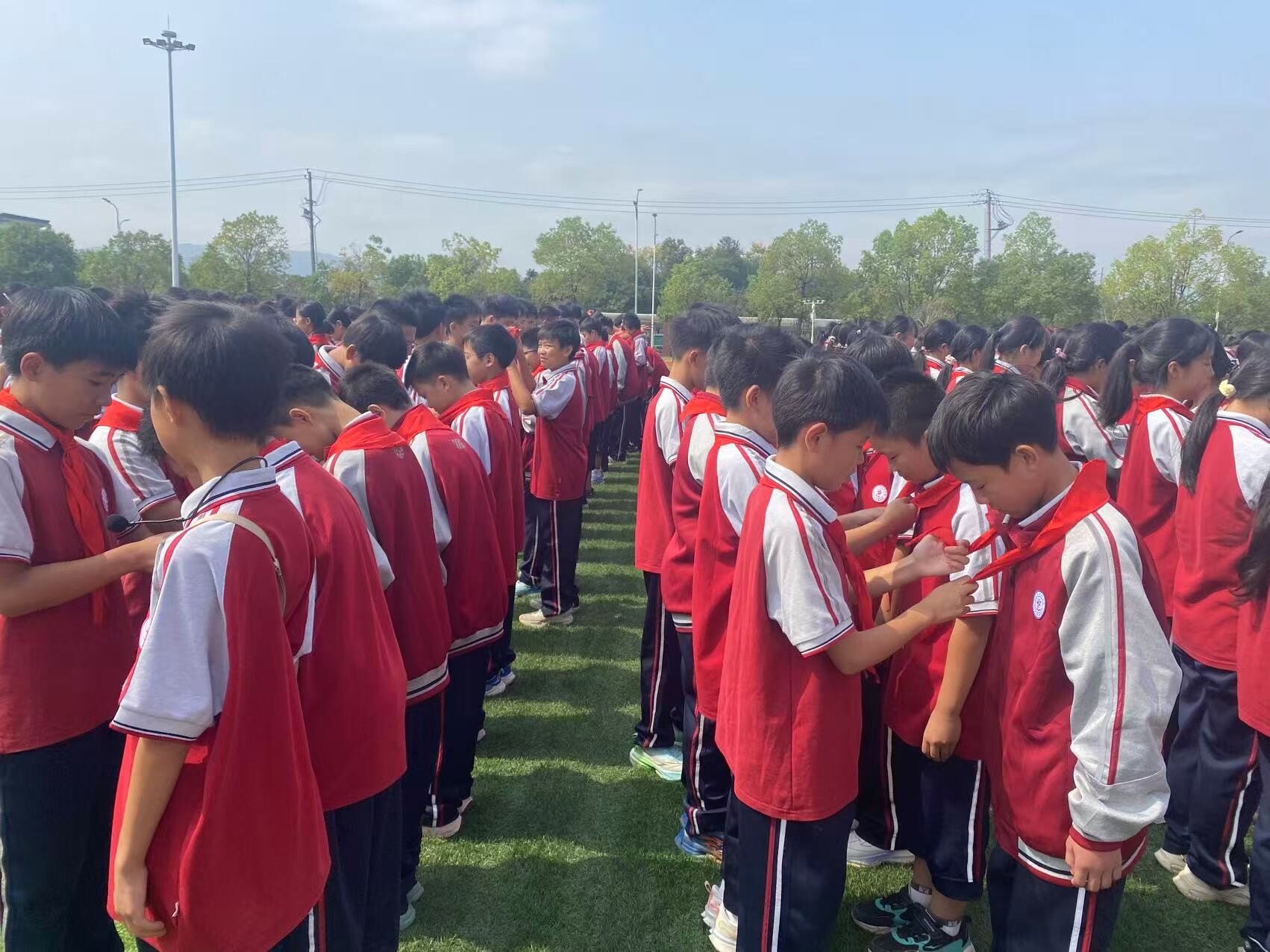 仪式中,主持人宣读成立新中队的决定,大队长宣布新队员名单。老队员代表与辅导员们为新队员佩戴红领巾,那一抹鲜艳的红色,不仅是荣誉的象征,更是沉甸甸的责任。新队员面向队旗,在大队辅导员领誓下庄严宣誓,随后依次报出姓名,稚嫩的声音中透着坚定,表达着“为共产主义事业而奋斗”的决心。接着,学校大队辅导员为新中队授旗,德育主任为新聘中队辅导员颁发聘书,新辅导员代表上台承诺,将全力以赴助力队员健康成长,为少先队事业贡献力量。