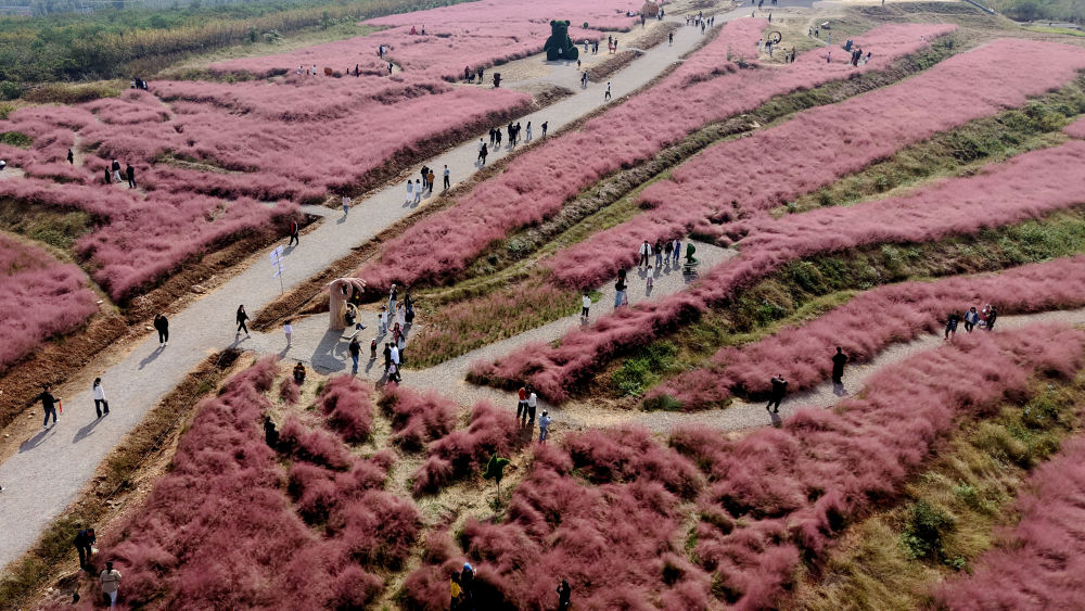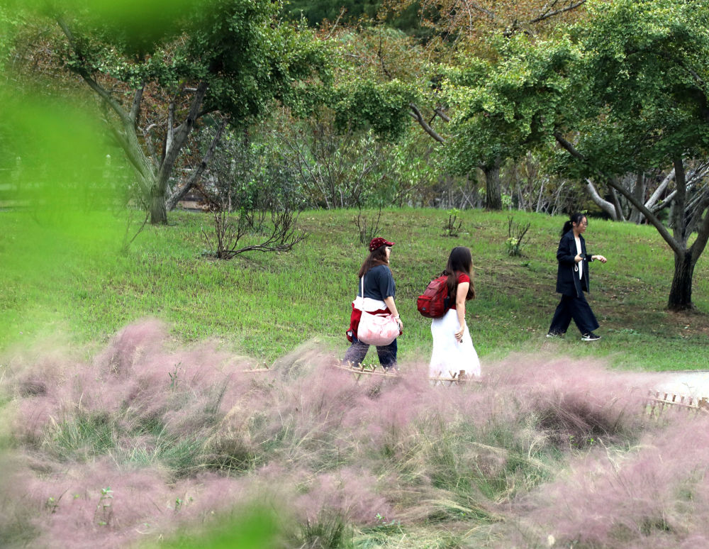 ↑ 10月17日,游客在山东省烟台市黄渤海新区海螺广场粉黛花海游玩。新华社发(孙文潭摄)