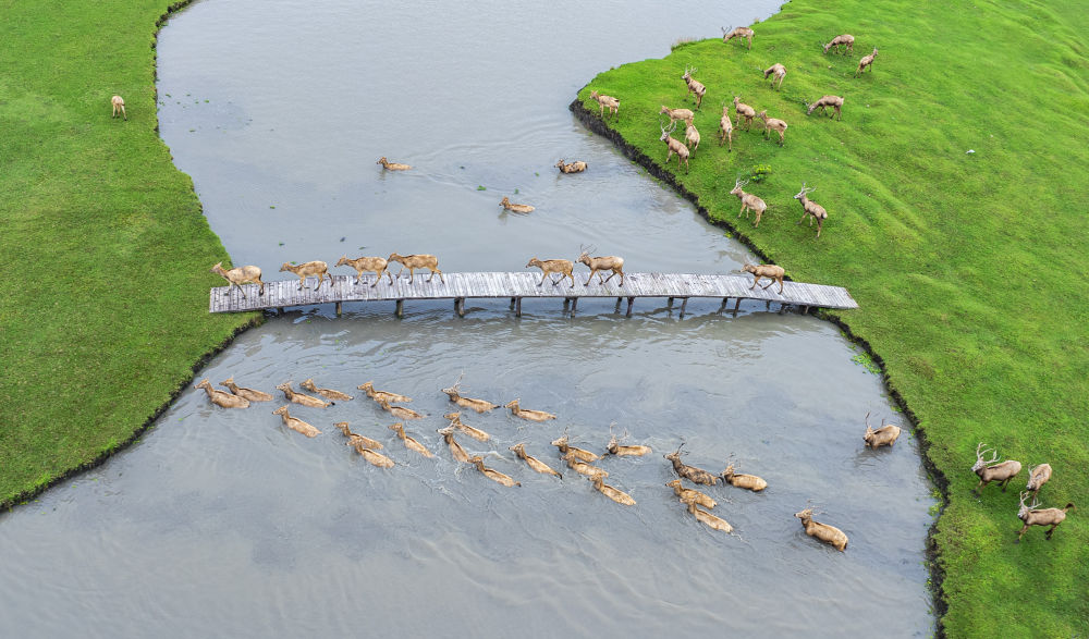↑ 10月17日,在江苏省泰州市姜堰区溱湖国家湿地公园,一群麋鹿通过独木桥(无人机照片)。新华社发(周社根 摄)