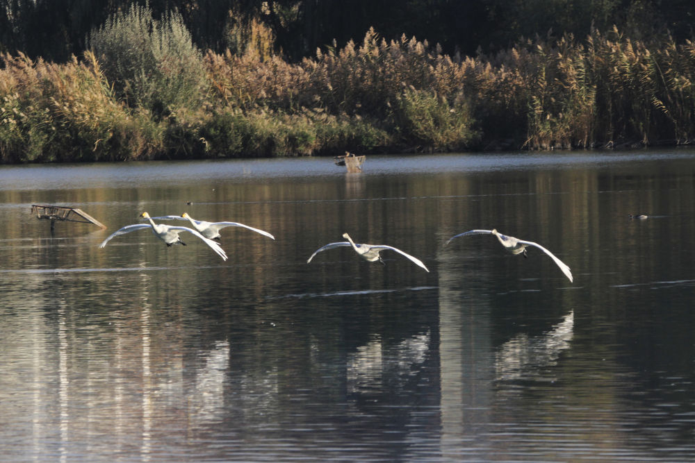 ↑ 10月17日在甘肃省张掖市国家湿地公园鹤影湖拍摄的白天鹅。新华社发(陈礼摄)
