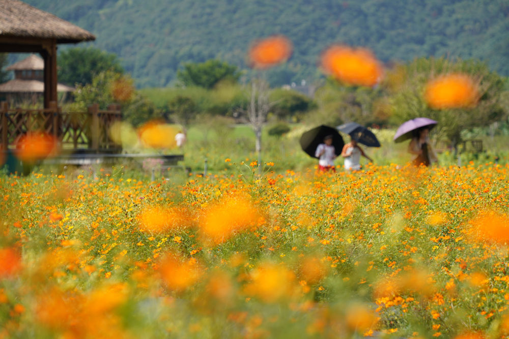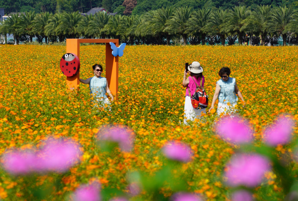 ↑ 10月18日,游客在浙江省乐清市清江镇北塘村赏花拍照。新华社发(蔡宽元摄)