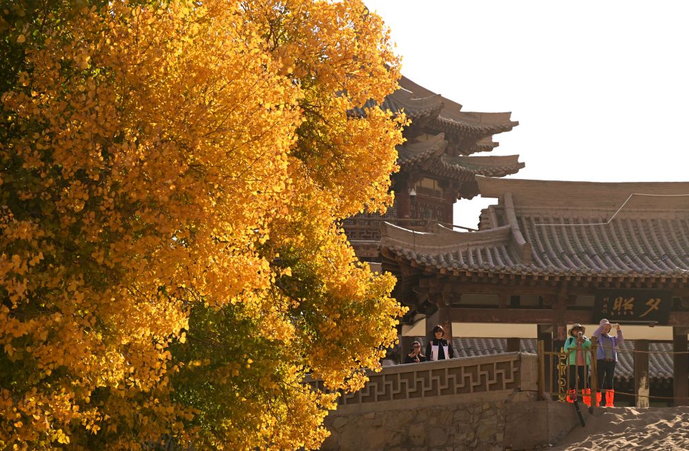 ↑ 10月18日,游客在甘肃省敦煌市鸣沙山月牙泉景区的胡杨前拍照。新华社发(张晓亮摄)