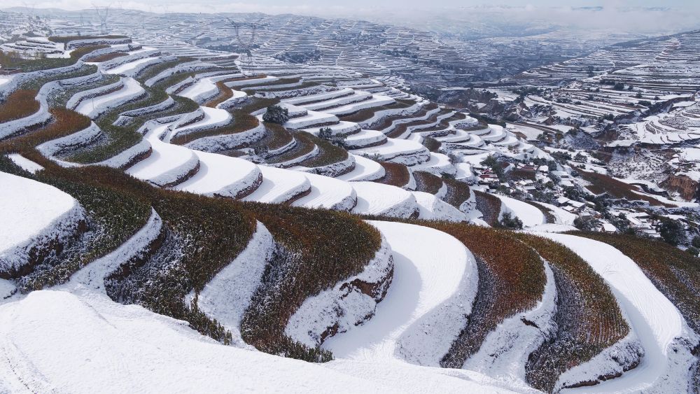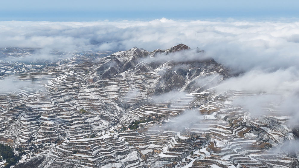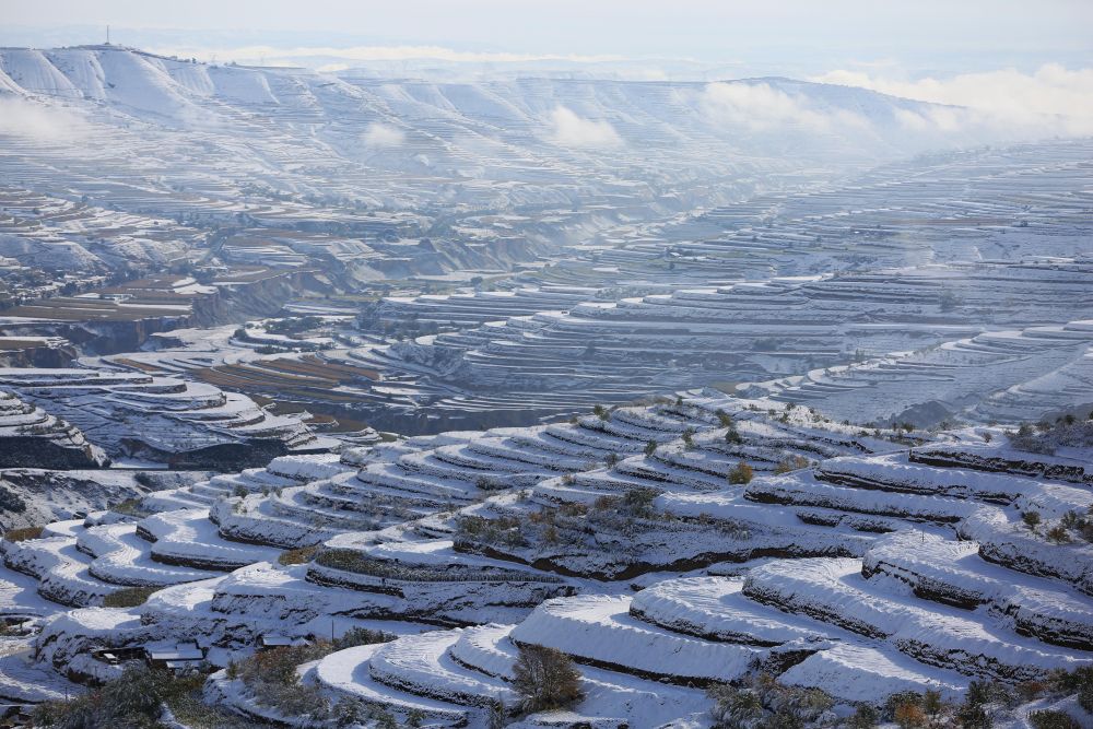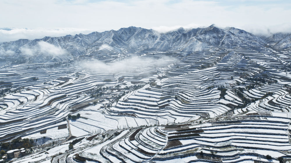 ↑ 这是10月17日在甘肃永靖县陈井镇拍摄的雪后梯田(无人机照片)。新华社发(史有东摄)