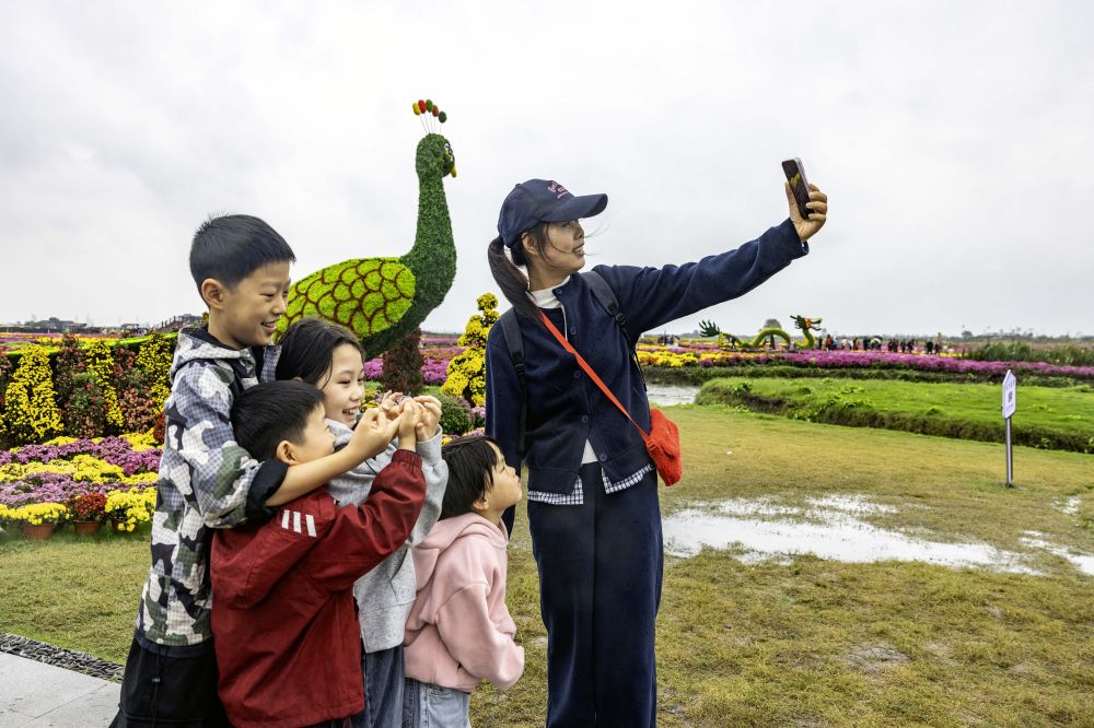 ↑ 10月18日,游客在云南省昆明大观公园内拍照打卡。新华社发(郑益摄)