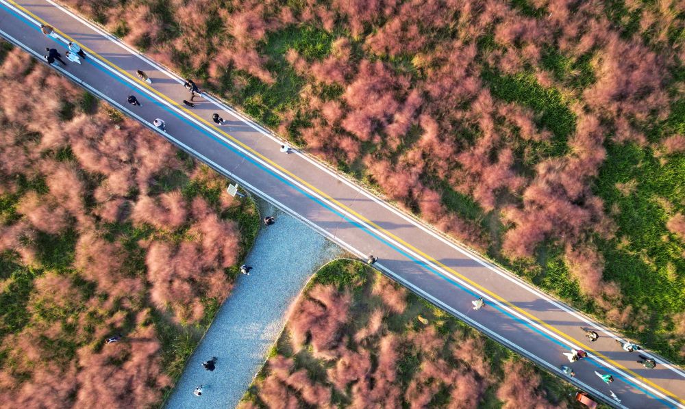 ↑ 10月18日,游客在山东省东营市东营区耿井湿地粉黛乱子草“花海”拍照打卡(无人机照片)。新华社发(刘智峰摄)