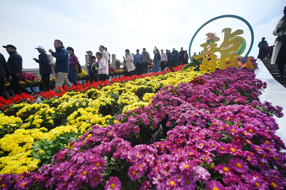 ↑ 10月18日,游客在河南省开封市龙亭公园内观赏菊花。新华社发(李俊生摄)