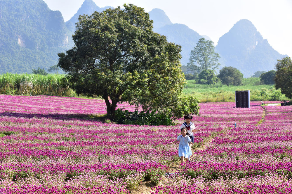 ↑ 10月18日,小朋友在广西崇左市大新县峒那屿湾景区赏花游玩。新华社发(廖祖平摄)