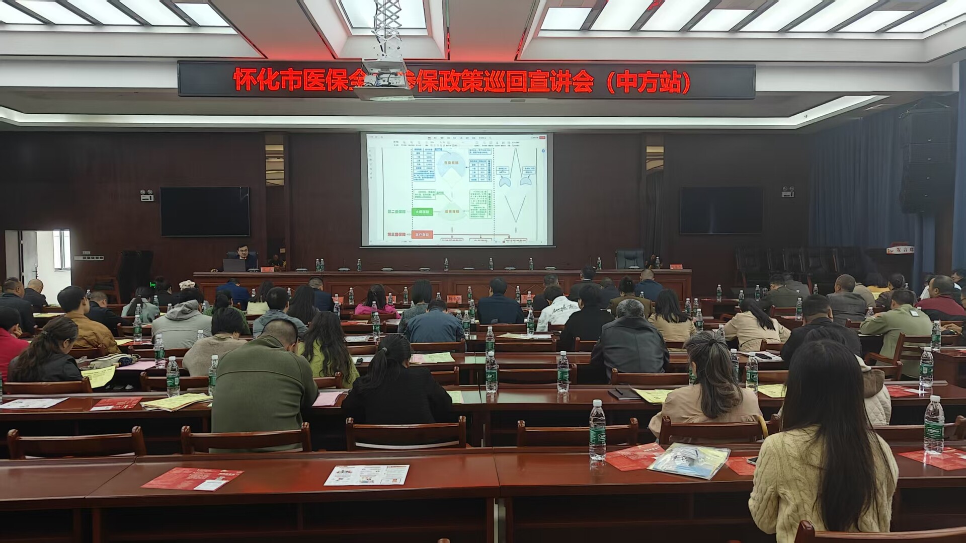 中方融媒10月27日讯(记者:王子豪)10月27日,怀化市医保政策巡回宣讲会(中方站)在县公安局会议室召开,市医保局相关负责同志作待遇政策解读,县领导杨小华讲话,县医保局、税务局、各乡镇分管领导、医保专干,大病保险承办机构、通信运营商相关负责人及和定点医疗机构负责人参加。