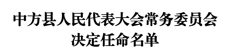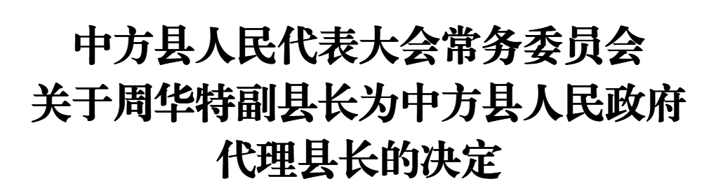 中方县第六届人民代表大会常务委员会第三十次会议决定:周华特副县长为中方县人民政府代理县长。