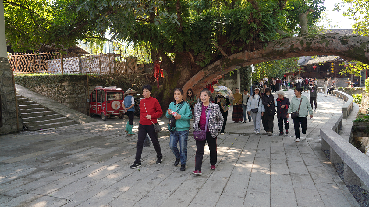 在荆坪古村驿道文化体验馆,游客们通过沉浸式参展,切身感受着古代驿道的历史厚重与昔日繁忙;移步至明清古建筑潘氏宗祠,一场原汁原味的地方阳戏正在古朴沧桑的戏台上演,悠远的唱腔与斑驳的建筑相得益彰,引得现场掌声阵阵。