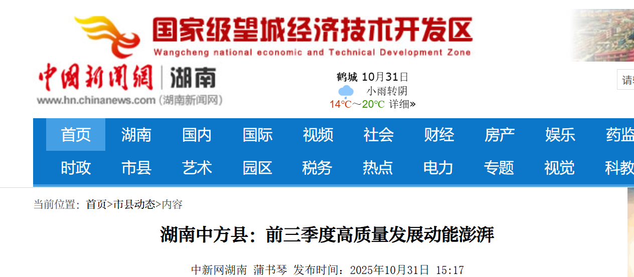 中新网湖南新闻10月31日电 (蒲书琴)希望的田野上稻浪翻金、硕果盈枝,处处洋溢着五谷丰登的喜悦;重点项目工地上,塔吊林立勾勒出跃动的天际线;现代化产业园区内,机械轰鸣奏响产业升级的乐章;焕发新生的荆坪古村内,“央视效应”加持,四海八方的游客慕名而来……10月,湖南怀化市中方县处处涌动着发展的热潮与丰收的喜悦。