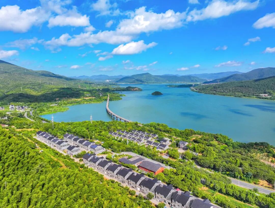 浙江省湖州市长兴县小浦镇合溪村,水库与青山、村庄、道路相映成景,构成一幅风光旖旎、生态秀美的绿水青山壮丽画卷。陈海伟 摄