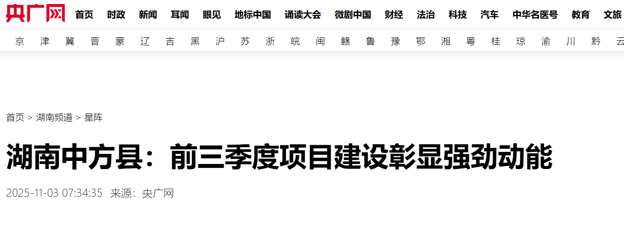 10月29日,在怀化市委、市政府召开的2025年三季度经济形势分析暨“项目建设年”活动讲评会上,中方县作经验交流发言。前三季度,全县固定资产投资增长13%,排全市第1。这份沉甸甸的荣誉,不仅是中方县坚定不移抓项目、凝心聚力促发展的生动注脚,更是全县上下实干担当、锐意进取交出的一份靓丽成绩单。