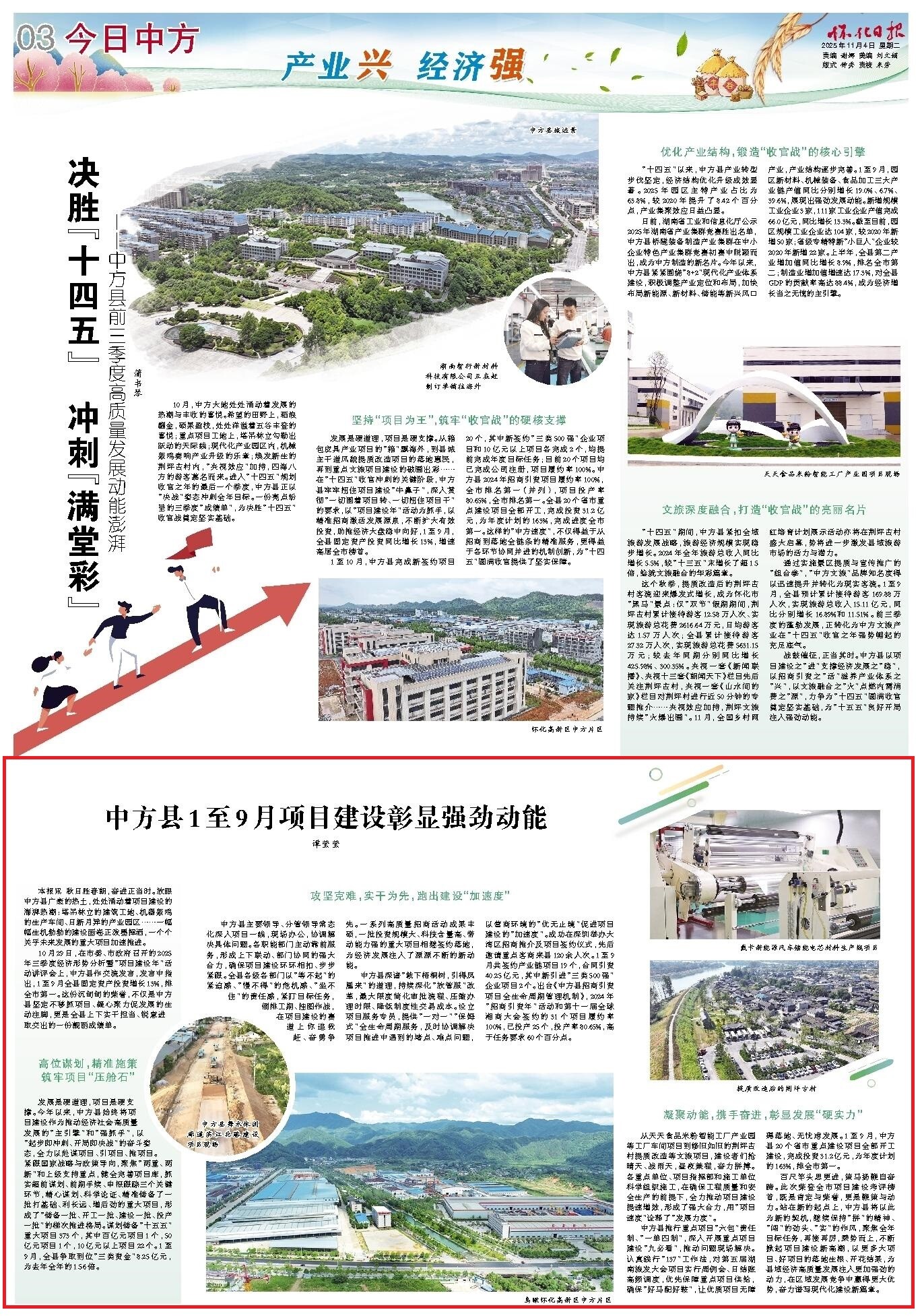 10月29日,在市委、市政府召开的2025年三季度经济形势分析暨“项目建设年”活动讲评会上,中方县作交流发言,发言中指出,1至9月全县固定资产投资增长13%,排全市第一。这份沉甸甸的荣誉,不仅是中方县坚定不移抓项目、凝心聚力促发展的生动注脚,更是全县上下实干担当、锐意进取交出的一份靓丽成绩单。