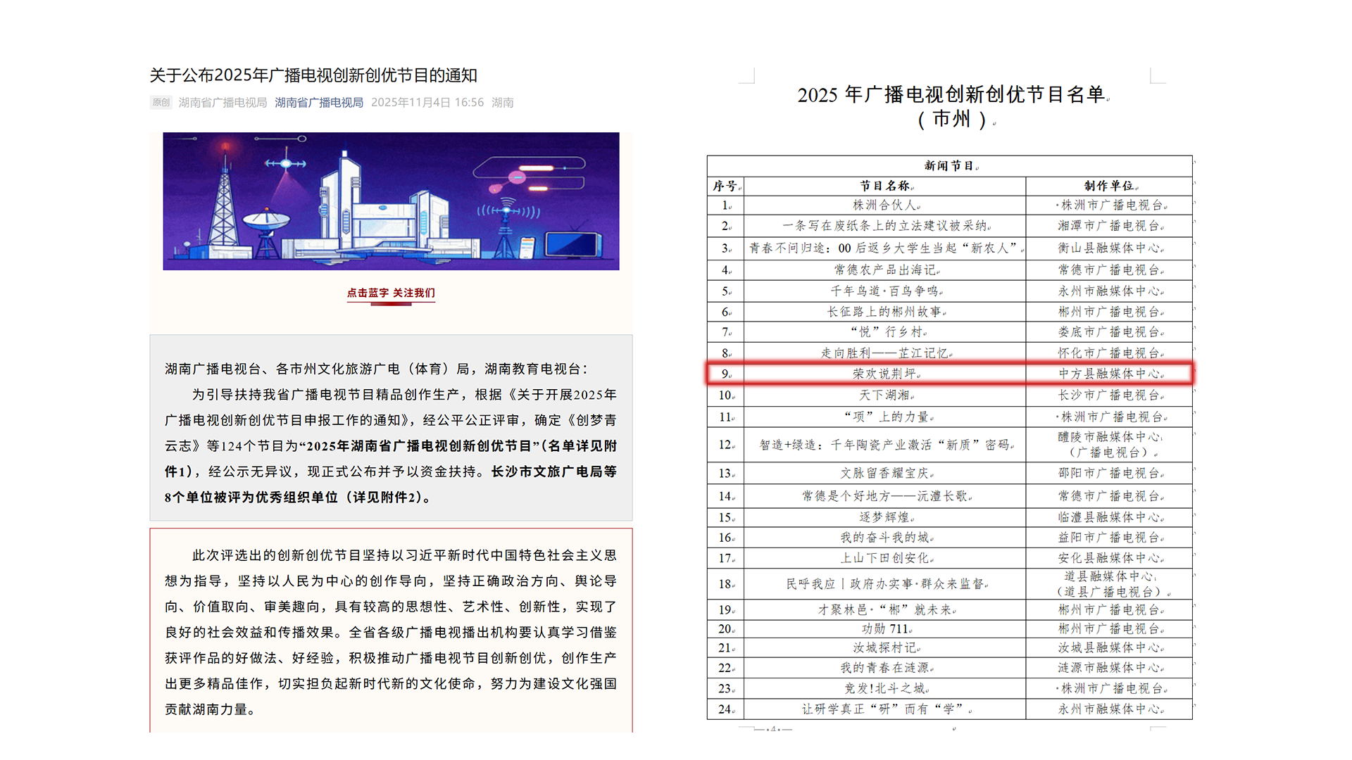 中方融媒11月5日讯(记者:陈攀)近日,从湖南省广播电视局传来喜讯,由中方县融媒体中心精心策划制作的电视短视频新闻节目《荣欢说荆坪》,经过严格评审,成功入选2025年度湖南省广播电视创新创优扶持节目名单。这是中方县广播电视节目创作在省级评选中取得的又一重要突破,标志着中方融媒在内容创新与精品生产方面迈上了新台阶。