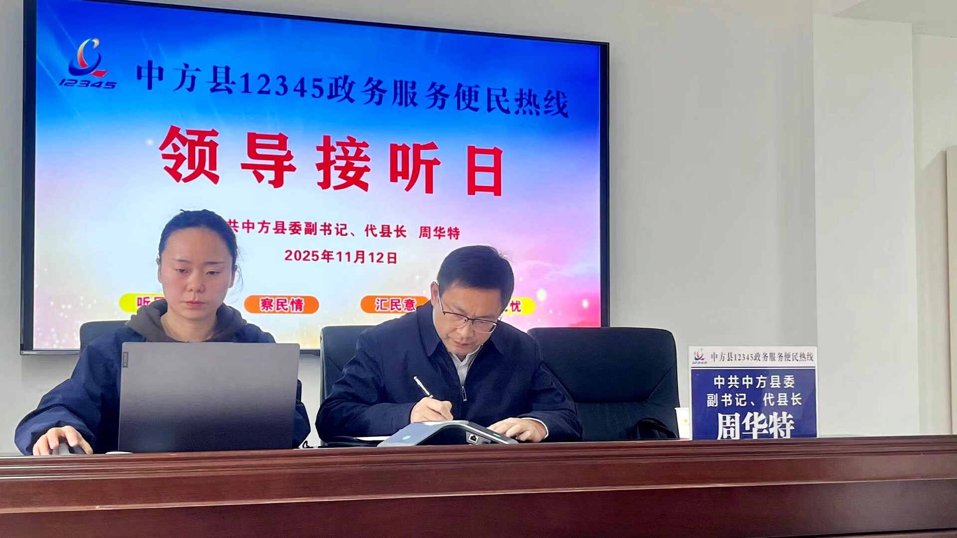 中方融媒11月12日讯(记者:李建龙)11月12日,县委副书记、代县长周华特来到县12345政务服务便民热线接听室,参加“领导接听日”活动,现场接听群众来电,积极回应群众关切。他强调,要深入贯彻落实习近平总书记关于加强和改进人民信访工作的重要思想,切实把以人民为中心的发展思想贯穿到各项工作全过程,用心用情用力解决好群众急难愁盼问题,让幸福中方更加可感可及。副县长刘强参加。