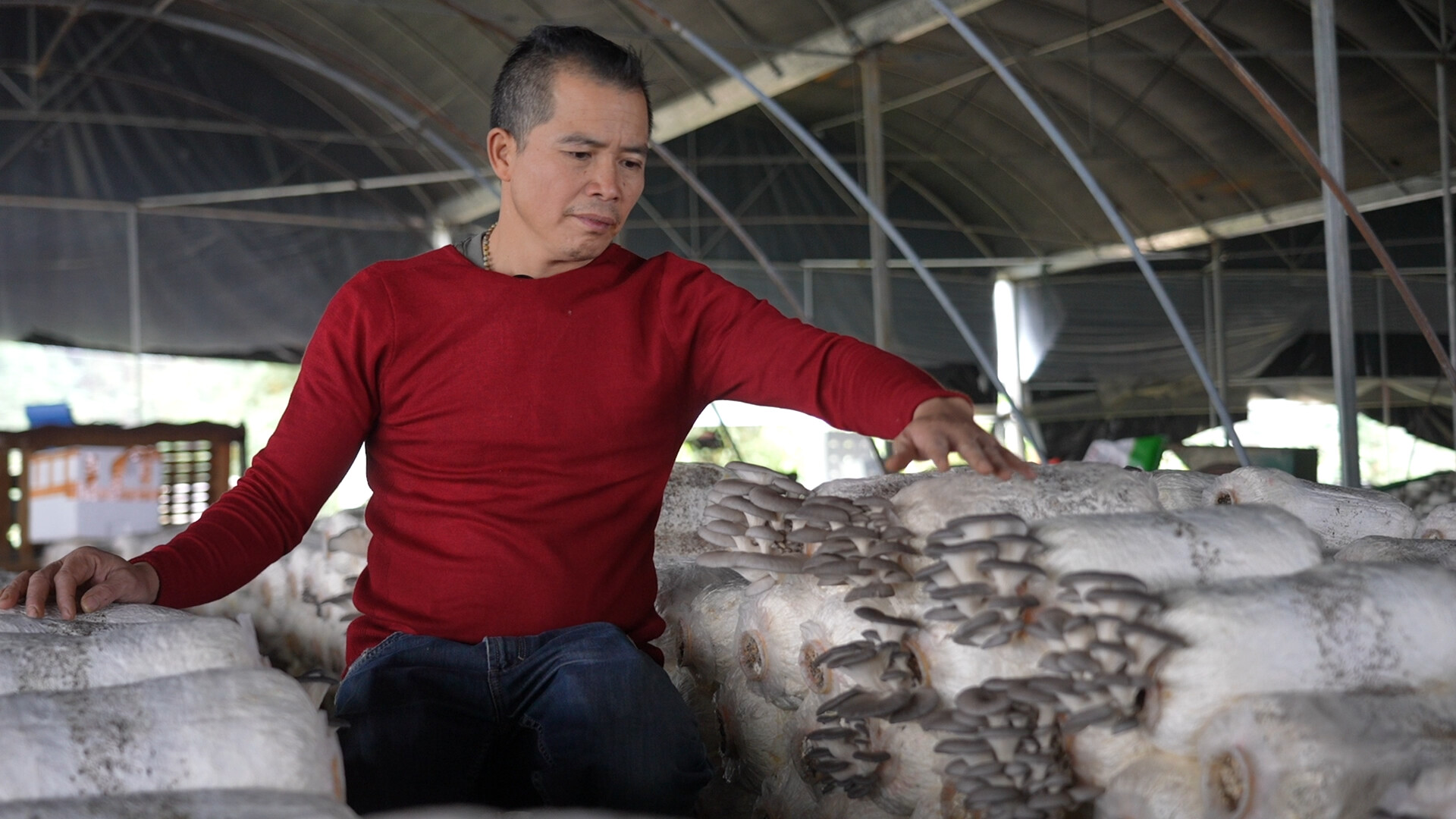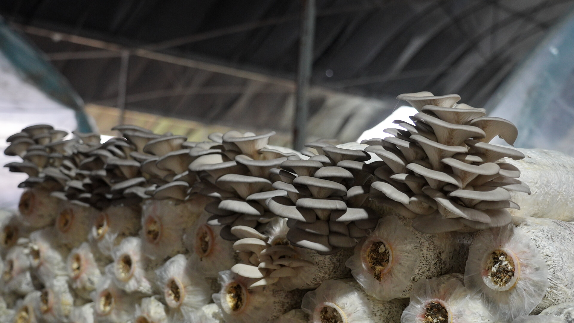 大棚另一头,工人们正在将刚刚制作好的菌棒码放在锅炉旁,锅炉燃烧产生的水蒸气在菌棒堆上缓缓蒸腾。每天,基地出产的平菇在市场上供不应求,为扩大产能,新一批菌棒正加紧制作。“这是我们刚出炉的菌棒,经过锅炉 100 度以上高温灭菌,时长不少于 18 个小时,这一炉就有 2800 个左右。” 罗红军指着新鲜出炉的菌棒说道。