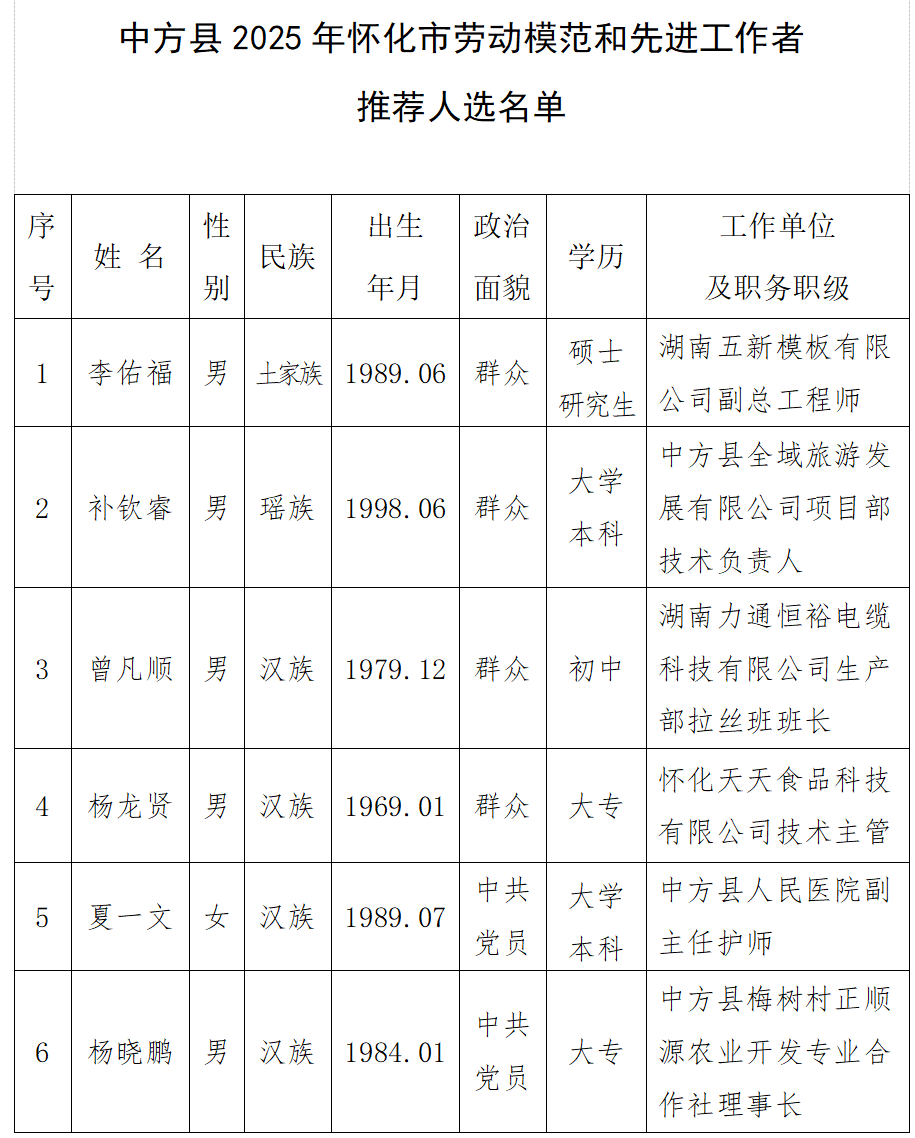 根据《中共怀化市委办公室怀化市人民政府办公室关于印发<2025年怀化市劳动模范和先进工作者推荐评选工作方案>的通知》有关规定,现对中方县2025年怀化市劳动模范和先进工作者推荐人选进行公示,公示时间为2025年11 月26日至12月2日。公示期间,如对推荐对象有异议,请以电话、信函等形式反映(信函以到达日邮戳时间为准)。反映情况须客观真实,以单位名义反映情况的材料需加盖公章,以个人名义反映情况的材料应署实名,并提供有效联系方式。
