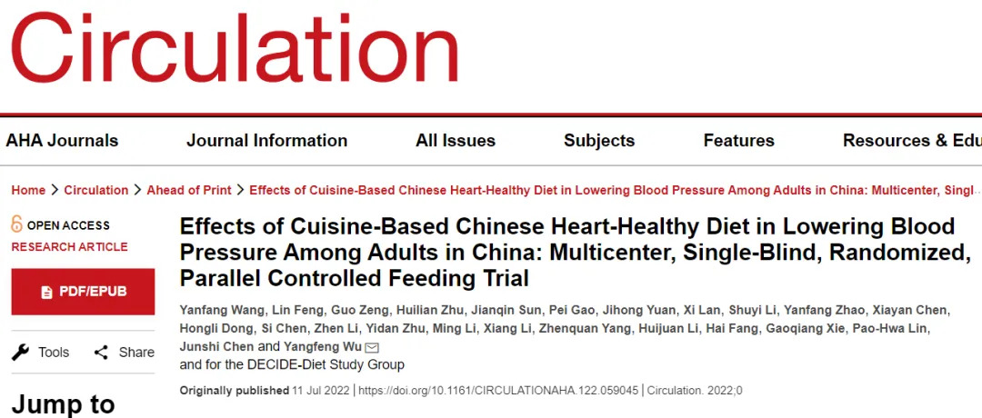 2022年,(Circulation)发表的一项由北京大学临床研究所武阳丰教授领导的研究发现,坚持“中国心脏健康饮食”,28天就能让收缩压平均下降15毫米汞柱,效果堪比降压药