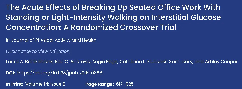 Brocklebank LA, Andrews RC, Page A, Falconer CL, Leary S, Cooper A. The acute effects of breaking up seated office work with standing or light-intensity walking on interstitial glucose concentration: A randomized crossover trial. J Phys Act Health. 2017;14:617625.