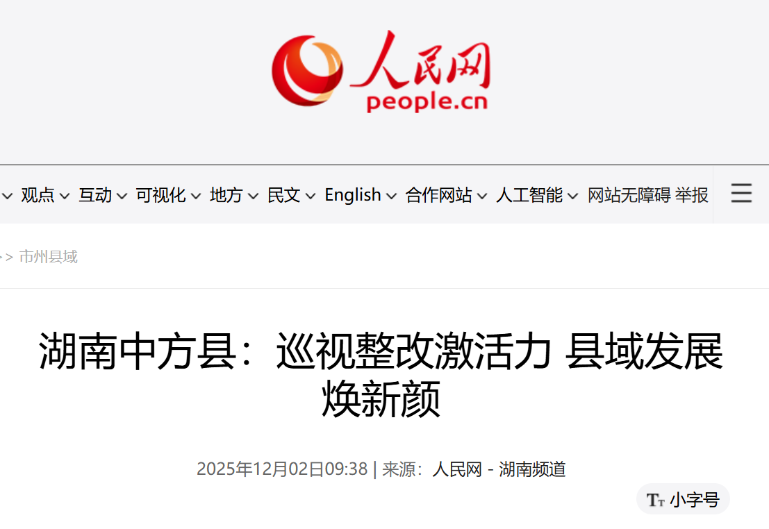 “现在办事更方便了,部门职责清晰,效率高了很多!”谈及湖南省中方县近期变化,当地群众纷纷点赞。中方县委编办机构精简效能倍增,中方县纪委监委正风肃纪激浊扬清,园区闲置厂房“腾笼换鸟”重焕新生,荆坪古村文旅融合实现蝶变升级……这一系列喜人变化,正是中方县委、县政府扛牢“真改实改、全面整改”的政治责任,将省委巡视反馈问题整改作为撬动高质量发展的着力点的生动写照。