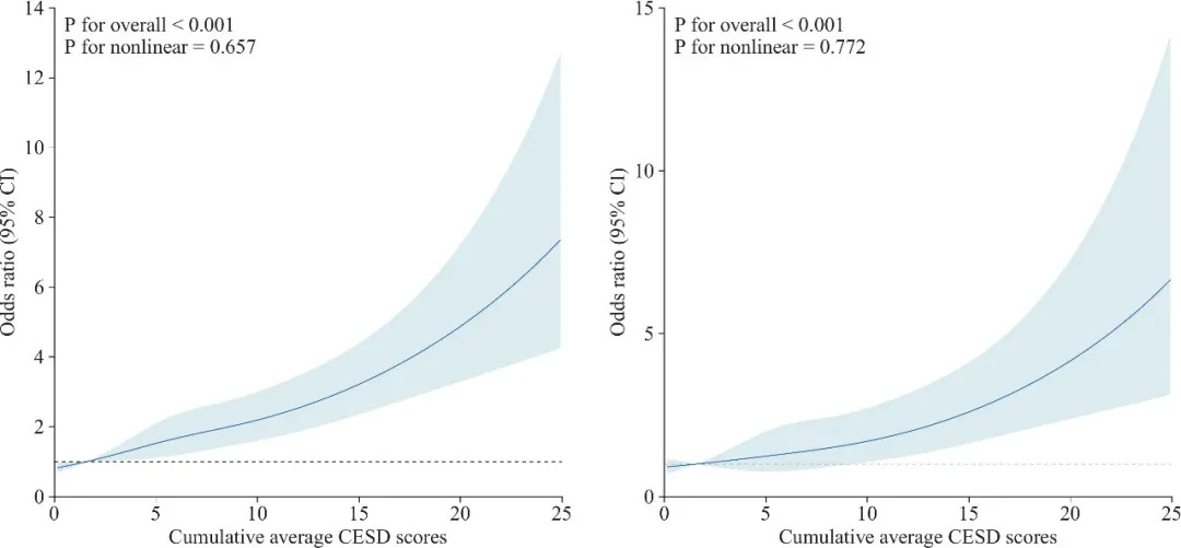 研究截图 抑郁量表得分与心脏病发作(左)和中风发病(右)之间的关联。