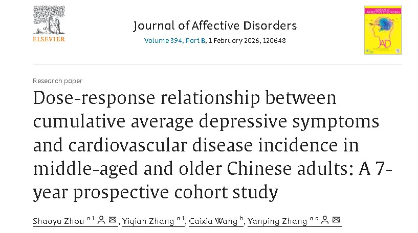 Zhou S, Zhang Y, Wang C, Zhang Y. Dose-response relationship between cumulative average depressive symptoms and cardiovascular disease incidence in middle-aged and older Chinese adults: A 7-year prospective cohort study. J Affect Disord. 2026;394(Pt B):120648. doi:10.1016/j.jad.2025.120648