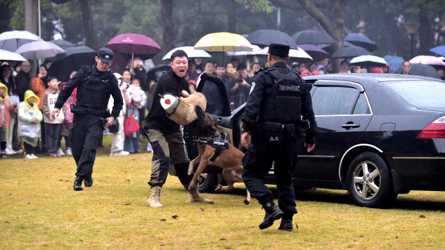 特巡警支队的K9机动单元车辆抓捕战术模拟演练,直接将现场氛围推向高潮。长沙市警犬基地训导员何树超与警犬“飞灵”配合默契,在他示意下,飞灵两三步便从一台下车右侧开着的车窗一跃而入,迅速扑向驾驶座上的助训员。整个过程如动作电影般干净利落、帅气逼人,引来现场阵阵惊呼。