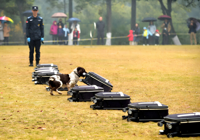 (警犬小七顺利找到装有毒品的箱子 摄像/曾斌)