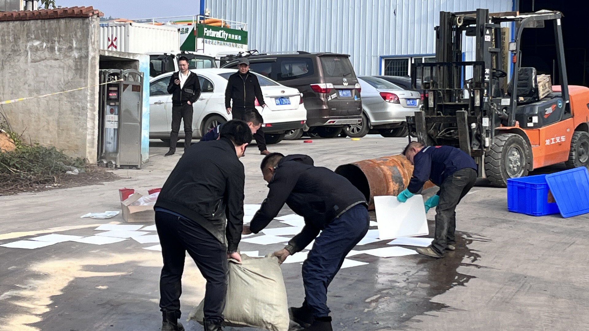 演练模拟了园区内某企业废矿物油桶搬运作业时,因操作不当发生泄漏的突发场景。事件发生后,企业迅速启动应急预案处置并上报,园区应急指挥体系随即响应,组建现场指挥部统一调度。演练过程中,安全警戒组、环境监测组、应急处置组、物资保障组各司其职、协同作战,快速完成现场封锁、采样监测、围堵吸附、物资供应等关键环节。