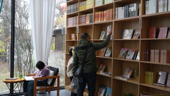 作为古村文艺打卡地的柚见图书馆内,不少游客正在安静的阅读,在书香里享受难得的惬意时光。这座玻璃书屋,与古村的青砖黛瓦相映成趣,现磨咖啡的香气与书香交融,在喧嚣中辟出一方静谧天地,成为游客休憩充电的好去处。
