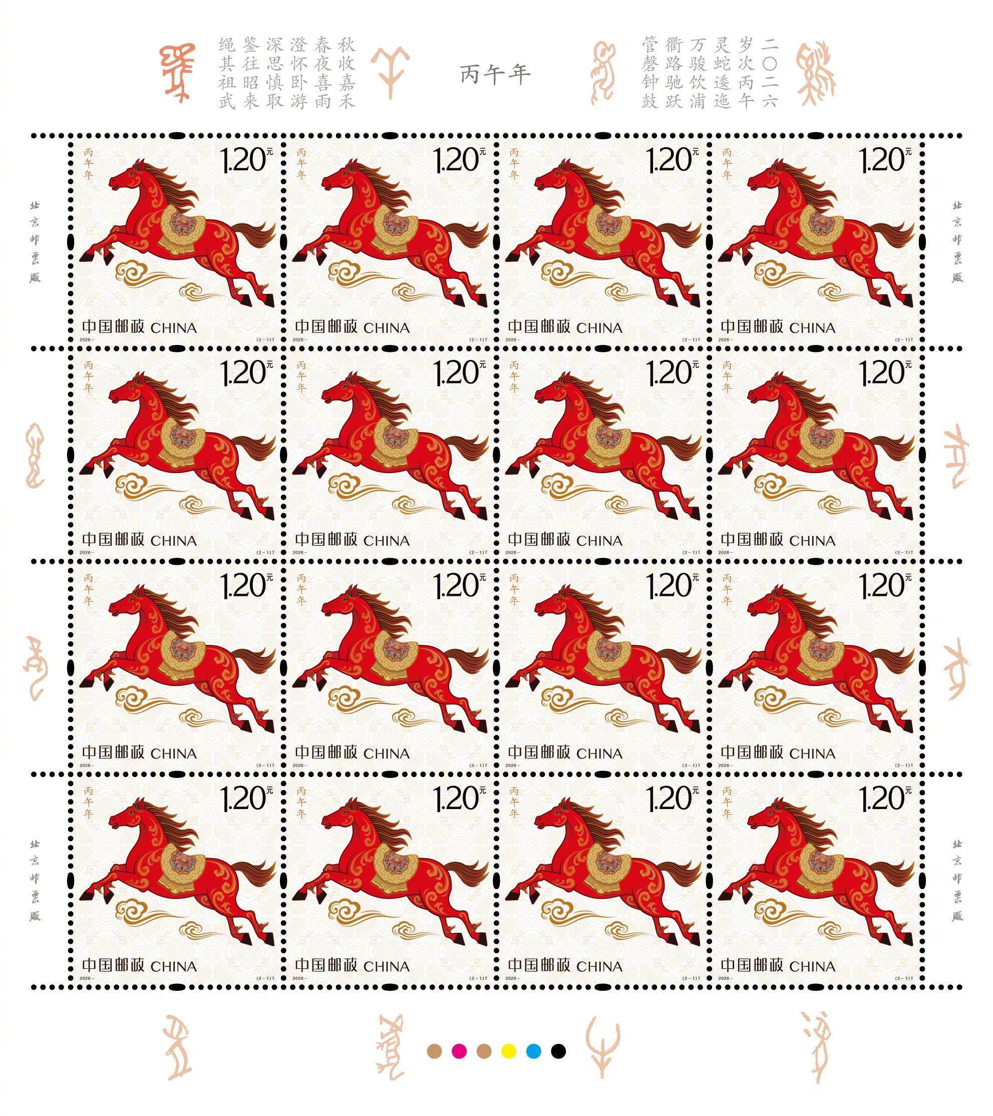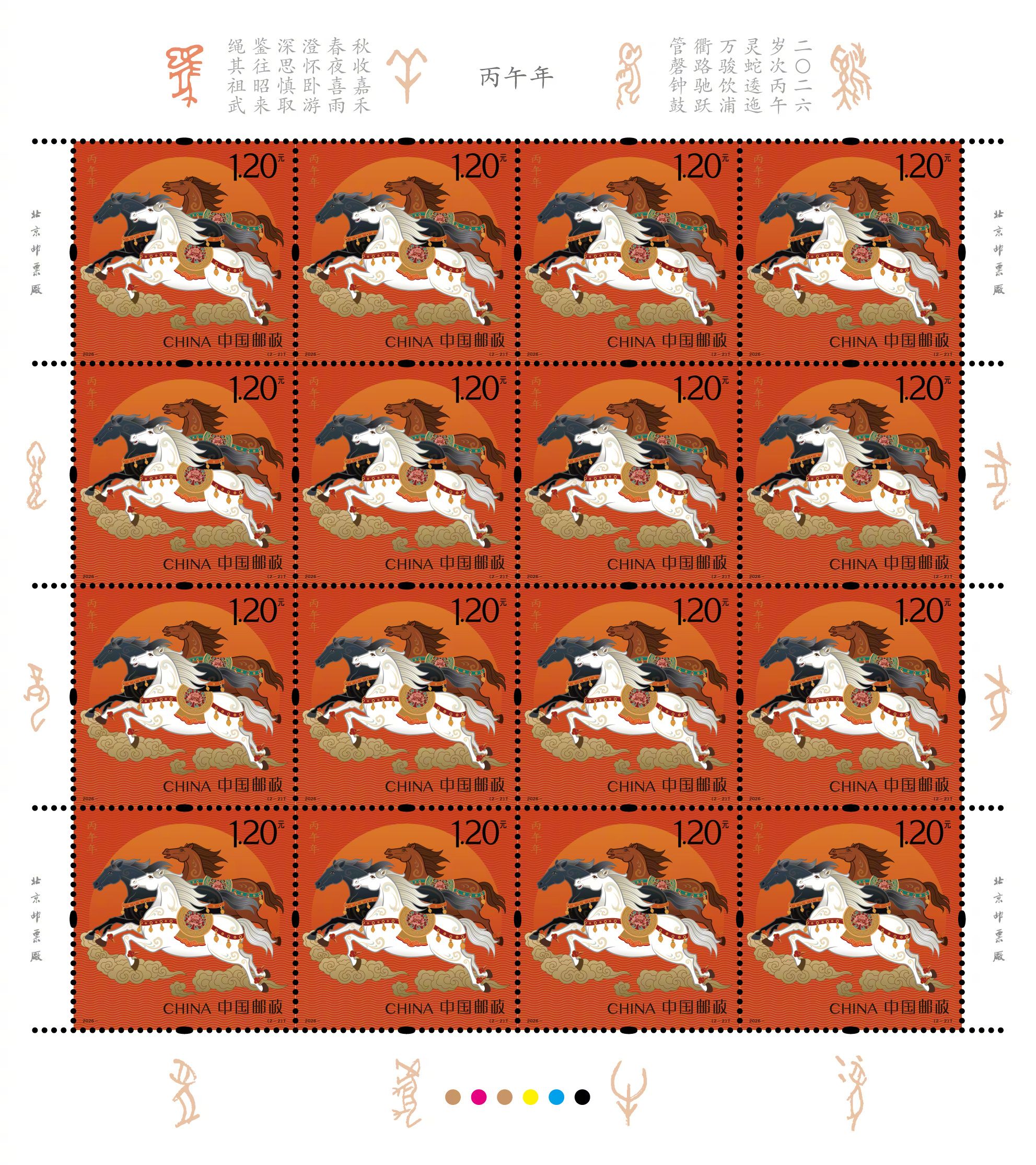 2026年《丙午年》特种邮票今日正式首发。一枚名为《驰跃宏图》,彰显力量;一枚名为《万骏臻福》,体现温情。整套邮票设计线条灵动,骏马姿态昂扬。