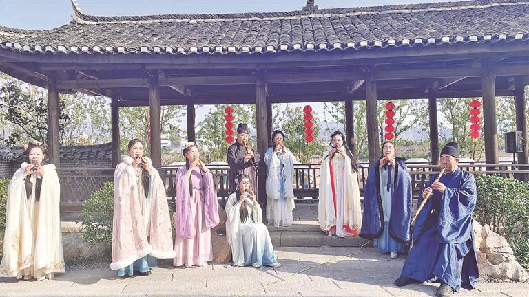埙箫协会和古琴协会成员以古村为幕进行现场表演