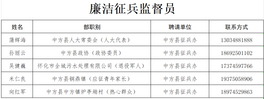 中方县人民政府征兵办公室关于公示廉洁征兵监督员及举报渠道的公告