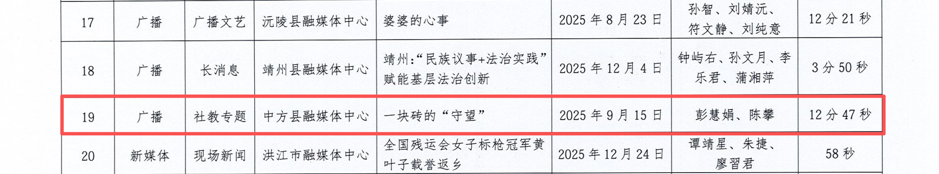 中方融媒2月3日讯 近日,怀化市广播电视学会对2025年度“怀化广播电视奖”的各类参评作品进行评审,共评选出2025年度“怀化广播电视奖”优秀作品102件,其中一等奖25件,二等奖31件,三等奖46件。中方县融媒体中心记者作品《传统节日里的中方系列微电影》《一块砖的“守望”》荣获一等奖;《荣欢说荆坪》荣获二等奖;《中方:“科技+文化”带火荆坪古村旅游新业态》《转角获新生》《中方籍球员张志豪:做好人踢好球,我与家乡共成长》荣获三等奖。