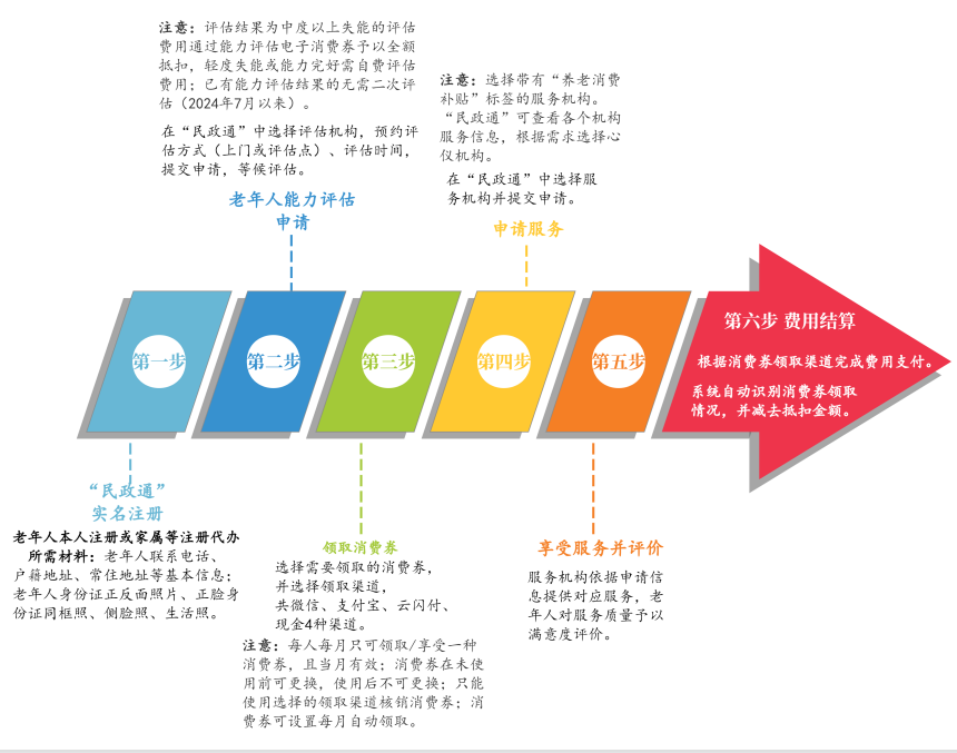 第一步要做老年人能力评估:老年人或其代办人(老年人配偶、子女、其他亲属、村、社区工作人员、养老服务机构工作人员等)可以通过“民政通”含小程序、APP)中的"能力等级自评"模块先进行自评,自评结果为中度、重度、完全失能等级,可在“民政通”平台上预约民政部门委托的第三方专业评估机构进行评估认定。第三方专业评估机构接到预约申请后,委派工作人员上门或站点内对老人进行评估。评估结果为中度以上老人就可以领取100元的能力评估券(能力评估券为一次性消费券,抵扣额度最高为每人100元,评估费用超出消费券部分由老人自行承担或由地方统筹安排)。