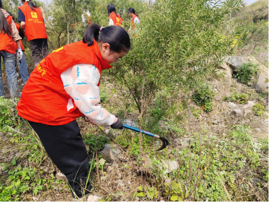 活动现场,大家精神饱满、干劲十足,手持镰刀、锄头、剪刀等工具,认真清理缠绕树木的枯藤、拔除杂草、修剪枯枝,红色马甲成为春日林间最亮眼的风景。