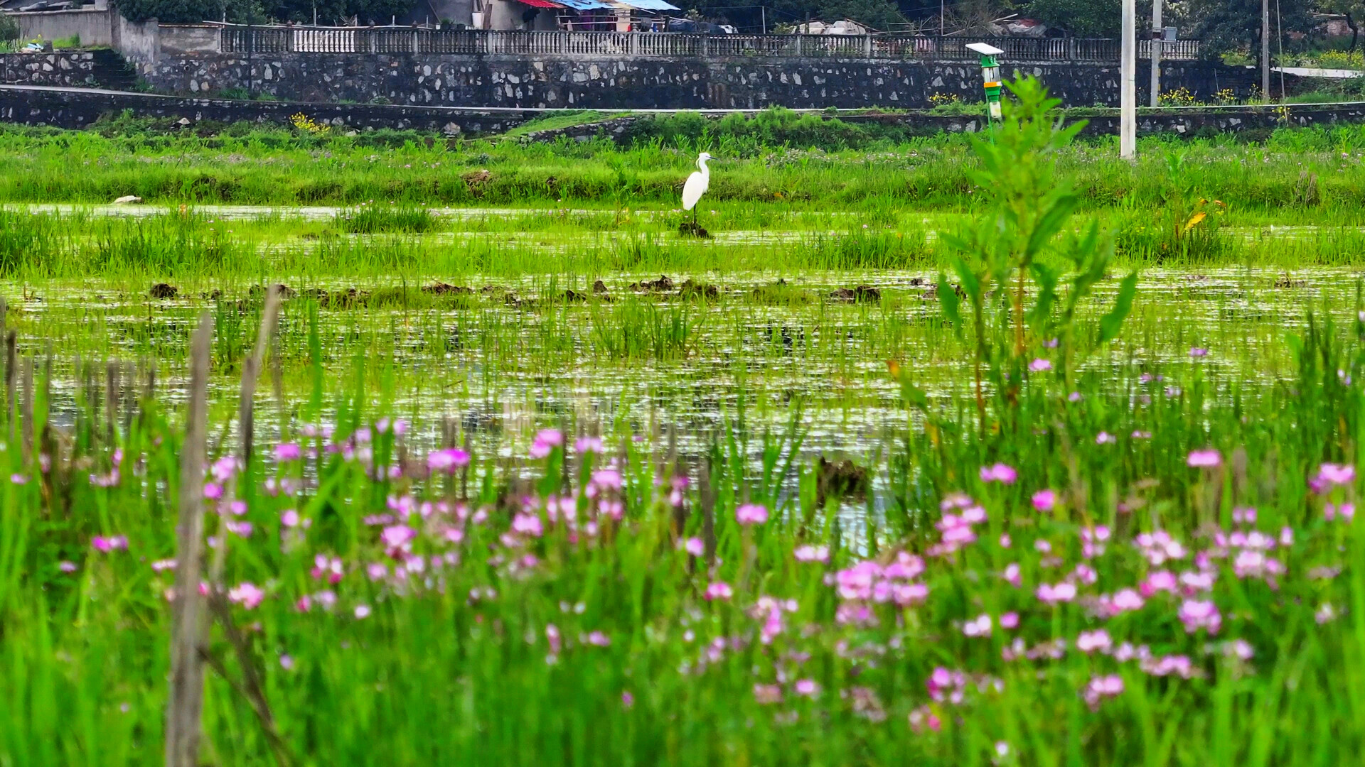 中方融媒3月27日讯(记者:杨森)近日,中方县花桥镇火马塘村水稻制种基地内,成片紫云英竞相绽放,紫色小花缀满枝头,点缀在青翠草丛间,与金黄的油菜花、错落有致的田园村舍交相辉映。白鹭在花丛间悠然觅食,小鸟踏着花浪踱步欢鸣,勾勒出一幅灵动秀美的乡村田园画卷。