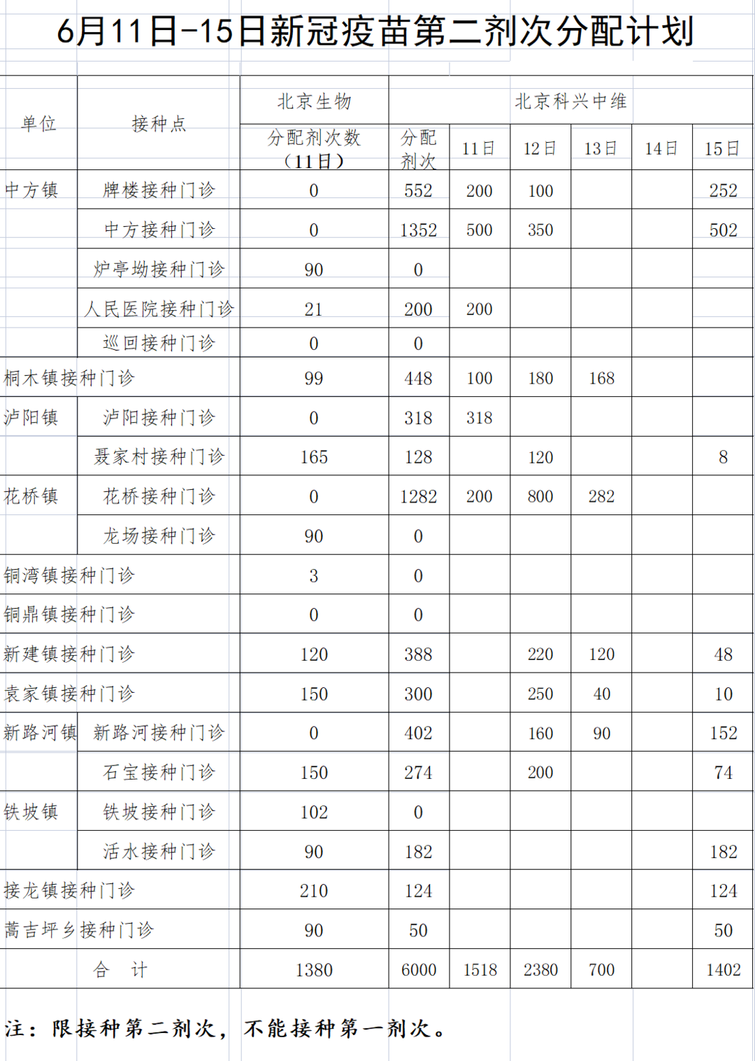6月11日至15日全县新冠病毒疫苗第二剂次接种计划及各接种点咨询电话如下: